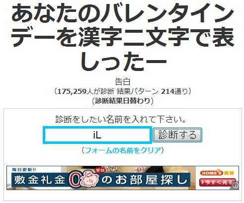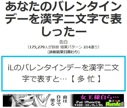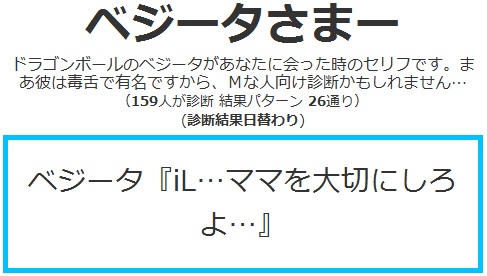 今日は私にしては珍しく、休日なのに午前に起きました。今日は雪でも降るんじゃないかな。。。 普通に快晴 あ、でもちょっと白い後残ってる。。。 まあ、私は別に地球に嫌われてないってことで^^ さて、診断メーカーとやらをやってみました。 私はツイッターが大嫌いで、見るだけでもむかむかしてくるのですが、まあ診断アプリ?に罪はないということでやってみました。 ツイッター診断メーカー なんでも自分で好きなように診断が作れるそうです。。。。。。が、作る気起きなかったので作りませんでした。 今度気が向いたら作ります(多分永遠に気が向かない 昨日の話です^^ なるほど、昨日私がチョコを貰えなかったのは忙しかったからなのか。。。 こんな風にフォローしてくれる優しい診断もあるようです。 ま、現実は夕方まで寝てましたんで貰う機会もありませんでしたがねw かの有名なべジータ様が私~Blood(iL)に出会った時、どんな罵詈雑言を吐くのかを診断してくれるそうですが。。。 優しい! べジータ様優しい! 彼は俺の母親の何だというんだ、というか俺の何を知っている!!www 初対面の地球人には決して言わないであろう言葉すらも口に出させる恐ろしい診断のようです。。。 まあこれはオマケというか。。。 とりあえずやってみました。東方キャラというとそれなりの人数がいるわけですが、一体だれから貰えるんだろ。。。^^ 神主貴様か 予想GUYすぎんだろオイィィィィィ! せっかくのバレンタインなんだからせめて女の子からほすぃいよ!! とまあ、こんな風に不意打ちもしてくれるようです。あ、別に神主が嫌いってわけじゃないですよ? 他にも診断やったのですが、記事にするのがいちいち面倒なのでいくつかPick Upして掲載することにしました。 是非とは言いませんが、皆さんもやってみてください。 そして結果報告yr おなか減ったので昼食でも食べることにします。。 では~ PR |