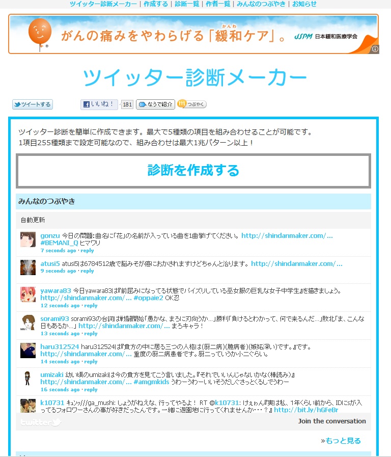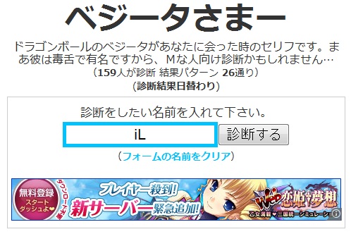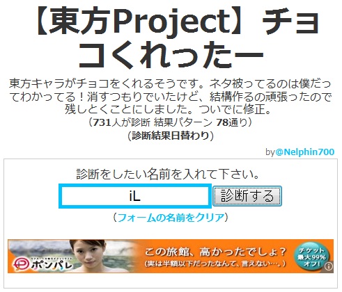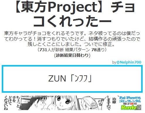 今日は私にしては珍しく、休日なのに午前に起きました。今日は雪でも降るんじゃないかな。。。 普通に快晴 あ、でもちょっと白い後残ってる。。。 まあ、私は別に地球に嫌われてないってことで^^ さて、診断メーカーとやらをやってみました。 私はツイッターが大嫌いで、見るだけでもむかむかしてくるのですが、まあ診断アプリ?に罪はないということでやってみました。 ツイッター診断メーカー なんでも自分で好きなように診断が作れるそうです。。。。。。が、作る気起きなかったので作りませんでした。 今度気が向いたら作ります(多分永遠に気が向かない 昨日の話です^^ なるほど、昨日私がチョコを貰えなかったのは忙しかったからなのか。。。 こんな風にフォローしてくれる優しい診断もあるようです。 ま、現実は夕方まで寝てましたんで貰う機会もありませんでしたがねw かの有名なべジータ様が私~Blood(iL)に出会った時、どんな罵詈雑言を吐くのかを診断してくれるそうですが。。。 優しい! べジータ様優しい! 彼は俺の母親の何だというんだ、というか俺の何を知っている!!www 初対面の地球人には決して言わないであろう言葉すらも口に出させる恐ろしい診断のようです。。。 まあこれはオマケというか。。。 とりあえずやってみました。東方キャラというとそれなりの人数がいるわけですが、一体だれから貰えるんだろ。。。^^ 神主貴様か 予想GUYすぎんだろオイィィィィィ! せっかくのバレンタインなんだからせめて女の子からほすぃいよ!! とまあ、こんな風に不意打ちもしてくれるようです。あ、別に神主が嫌いってわけじゃないですよ? 他にも診断やったのですが、記事にするのがいちいち面倒なのでいくつかPick Upして掲載することにしました。 是非とは言いませんが、皆さんもやってみてください。 そして結果報告yr おなか減ったので昼食でも食べることにします。。 では~ PR |